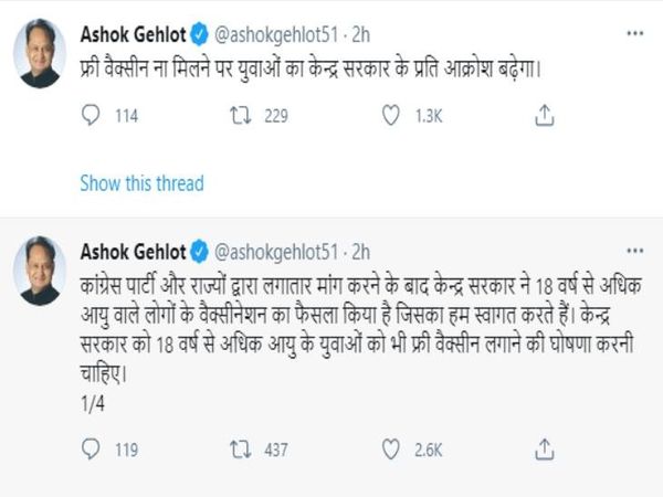 गहलोत ने सोशल मीडिया पर लिखा- कांग्रेस पार्टी और राज्यों द्वारा लगातार मांग करने के बाद केन्द्र सरकार ने 18 वर्ष से अधिक आयु वाले लोगों के वैक्सीनेशन का फैसला किया है, जिसका हम स्वागत करते हैं। केन्द्र सरकार को 18 वर्ष से अधिक आयु के युवाओं को भी फ्री वैक्सीन लगाने की घोषणा करनी चाहिए। फ्री वैक्सीन ना मिलने पर युवाओं का केंद्र सरकार के प्रति आक्रोश बढ़ेगा।