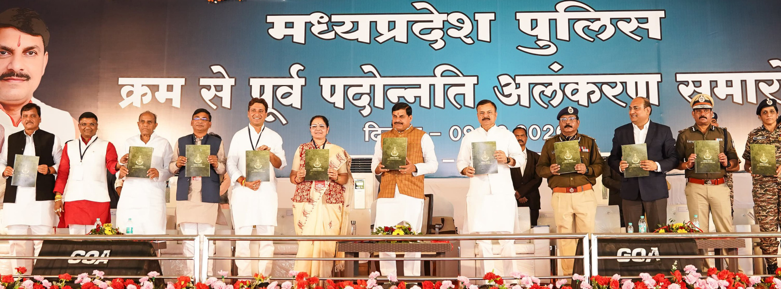 मुख्यमंत्री डॉ. यादव ने पदोन्नति पाने वाले जवानों में उप निरीक्षक से निरीक्षक के पद पर श्री विपिन चंद्र खलको, श्री इंदर सिंह विदूरी, श्री शुभम प्रताप सिंह तोमर, श्री रत्नेश मीणा, श्री नवदेश श्रीवास्तव को, सहायक उप निरीक्षक से उप निरीक्षक श्री मुनेन्द्र् सिंह को, प्रधान आरक्षक से सहायक उप निरीक्षक के पद पर श्री रूद्रीचंद जखमोला, श्री अनिल सिंह भदौरिया, श्री मत्ते सिंह मरावी, श्री उज्जवल घोरमारे, श्री मनोज कुमार यादव, श्री देवेन्द्रे धुर्वे, श्री रवेन्द्र कुशवाह, श्री हरेन्द्र सिंह, श्री प्रदीप गोसाई, श्री विनोद कुमार मर्सकोले, श्री उमेश कुमार पटेल, श्री विकाश कुमार राजपूत, श्री मुकेश सगर, श्री विवेक परस्ते, श्री राघवेन्द्र सिंह गुर्जर, श्री आशीष रजक, श्री शिवहरी मरावी, श्री प्रवीण धुर्वे, श्री टीकाराम ढकाल, श्री प्रवीण कुमार, श्री असित यादव, श्री रामआशीष यादव, श्री संदीप शर्मा, श्री लोकपाल धाकड़, श्री कृष्णा श्रेष्ठ, श्री जितेन्द्र सिंह पटेल और श्री वीर सिंह को पदोन्नत किया गया। श्री शकरचंद सरयाम, श्री सुनील परियार, श्री चन्द्रकांत पांडेय, श्री सत्यम द्ववेदी, श्री सुनील यादव, श्री देवराज कलमें, श्री सुरेन्द्र सिंह मार्को, श्री सुशील उईके, श्री रामलाल भील, श्री उमेश चन्द्र दुबे, श्री संतोष कुमार मरावी, श्री प्रदीप कुमार परते, श्री राजा मालवीय, श्री विशाल कुमार सिंह, श्री दीपक पवार, श्री कन्हैया मरकाम, श्री सुनील सिंह कुशवाह, श्री मुलायम सिंह, श्री वरूण देव सिंह चाहर, श्री मुनीष कुमार द्विवेदी, श्री नीलेश, श्री महेन्द्र सिंह, श्री रवि कुमार यादव, श्री छठु यादव, श्री सलेश कुमार द्विवेदी, श्री संजू शर्मा एवं जिला पुलिस बल के नरेन्द्र सोनवे को भी आरक्षक से प्रधान आरक्षक के पद पर पदोन्नत किया गया है। कार्यक्रम में हॉक फोर्स, पुलिस जवान एवं शहीद जवानों के परिजन उपस्थित थे।